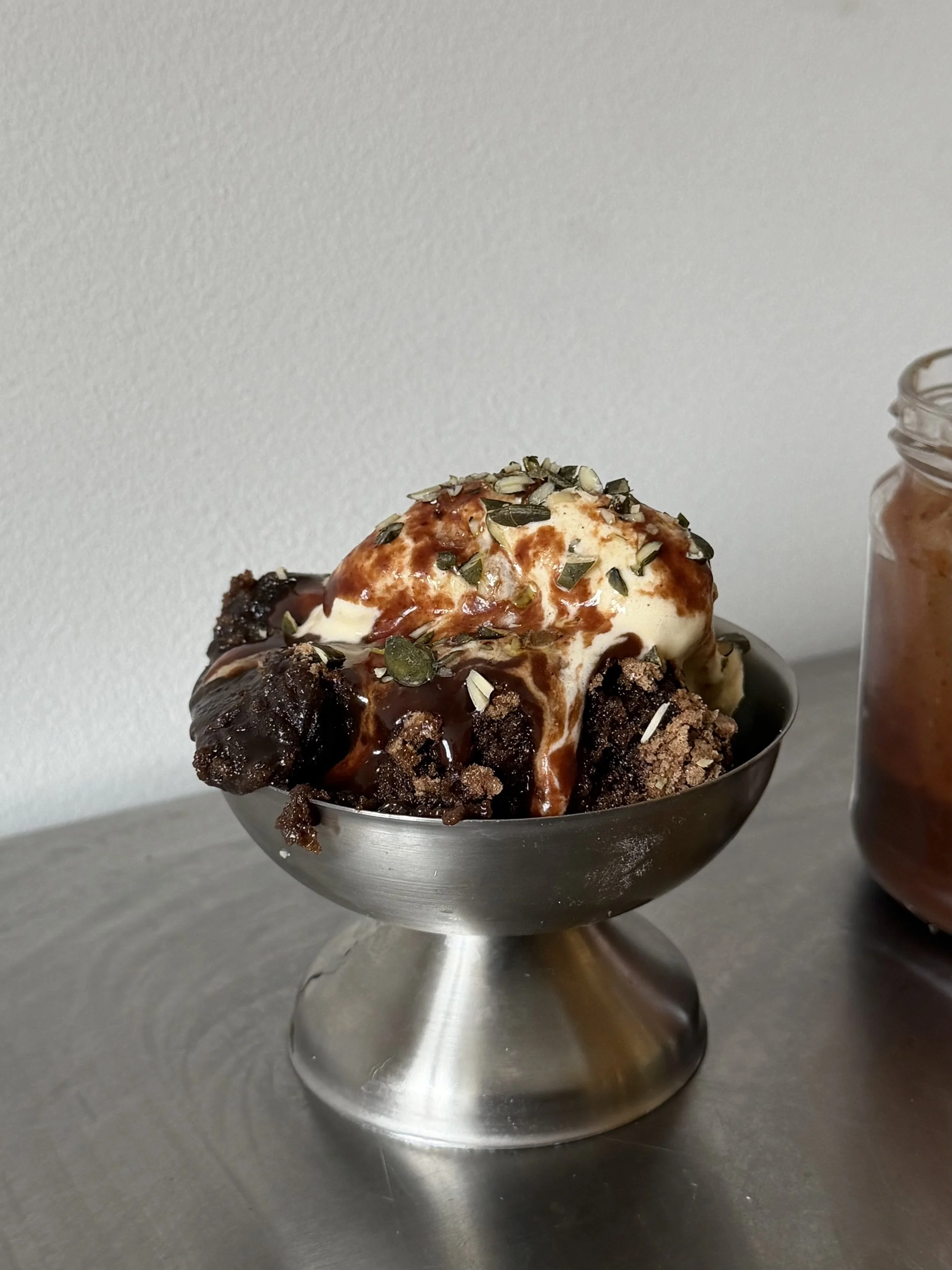 Nearly pudding-like brownie à la mode with salted hot fudge, golden extra virgin olive oil, and toasted seeds to help reduce blood sugar spikes.